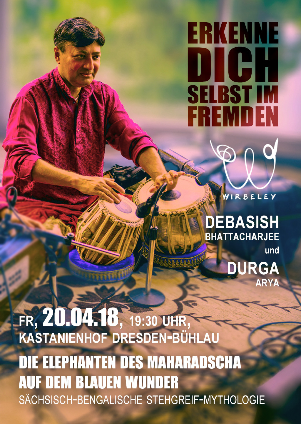 Nach einem fulminanten Konzertauftakt mit dem irakischen Kniegeiger Bassem Hawar im Februar begegnet das Ensemble WIRBELEY in seiner Veranstaltungsreihe »ERKENNE DICH SELBST IM FREMDEN« nun am 20.04.2018 den indischen Künstlern DEBASISH BHATTACHARJEE (Tabla) und DURGA ARYA (Kathak-Tanz) im Kastanienhof in Bühlau. Im Mittelpunkt des Konzerts steht der Prozess einer musikalischen Annäherung von Fremdscheinendem und der Weg zu einer gemeinsamen Sprache. Als »Barrierefreie Volksmusik« überschreibt die WIRBELEY pogrammatisch wie augenzwinkernd ihre Arbeit und möchte mit der Projektreihe ein breites Publikum an der Unmittelbarkeit und dem Erfüllenden der interkulturellen Begegnung teilhaben lassen.