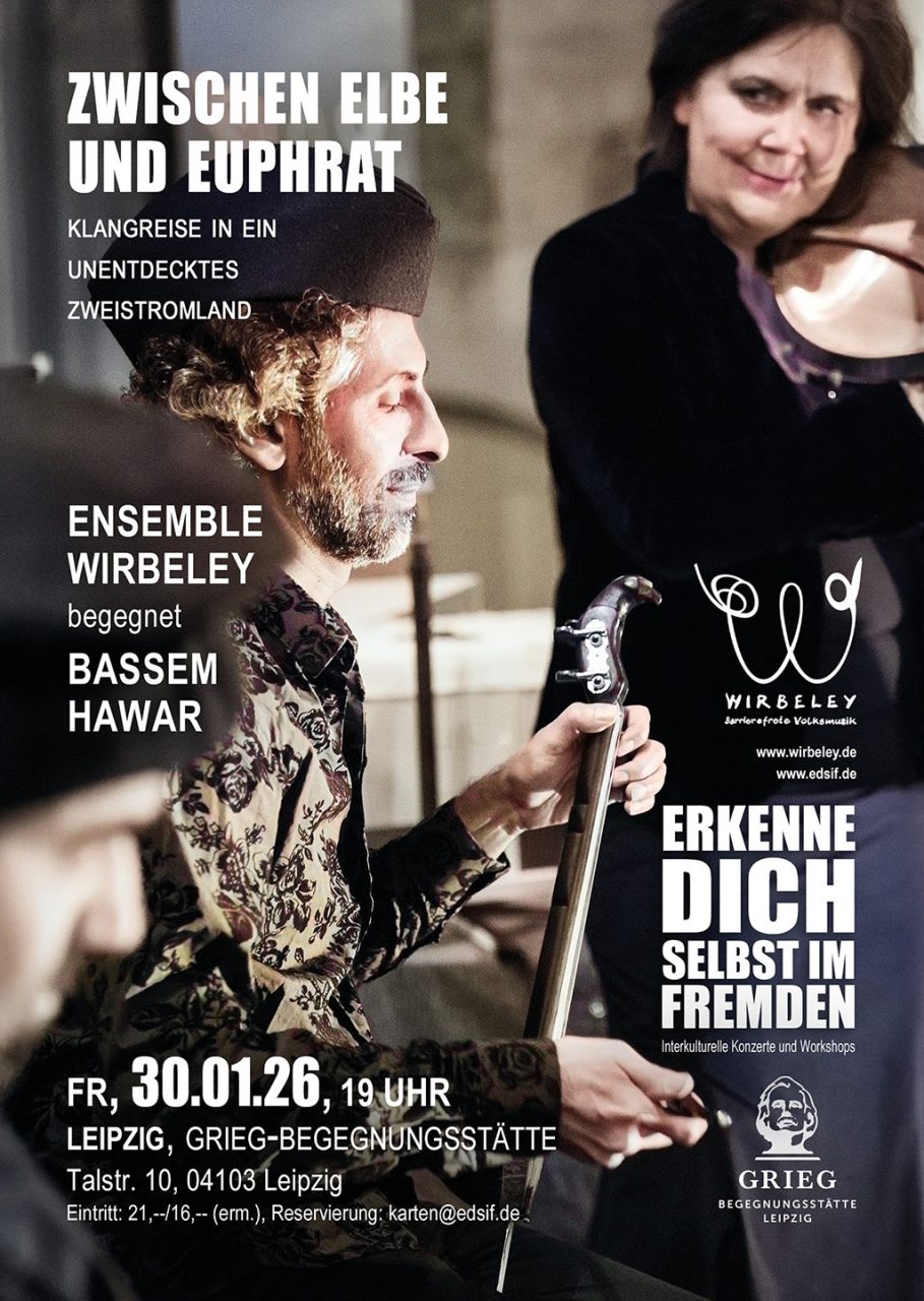 Auf eine beglückende Reise laden der aus Bagdad stammende Ausnahmemusiker BASSEM HAWAR mit seiner Djoze (Kniegeige) und das Ensemble WIRBELEY in der Reihe »Erkenne Dich selbst im Fremden« ein. Es erklingen zeitgenössische Kompositionen, für diese ungewöhnliche Kammermusikformation in Auftrag gegeben, sowie Traditionelles von Euphrat und Elbe in eigenen Bearbeitungen und Improvisationen. Wir sind den Klängen und Düften der Basare auf der Spur, ahnen die Weite von Wäldernund Wüsten, lauschen dem Gang der schönen Frauen in den Gassen Bagdads und der Abendstille überall.